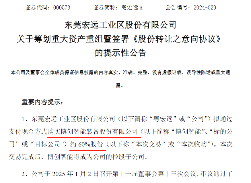 1月2日粤宏远A公告称,公司拟通过支付现款花样购买博创智能装备股份有限公司(以下简称“博创智能”)约60%股份。本次交游完成后,博创智能将成为公司的控股子公司。把柄初步测算,本次交游瞻望将组成《上市公司紧要钞票重组经管见识》限定的紧要钞票重组。